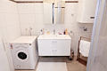 Unser Badezimmer verfügt über eine Dusche, ein Waschbecken mit Spiegelkasten und Kosmetikspiegel sowie eine Waschmaschine (ein Wäscheständer ist vorhanden).